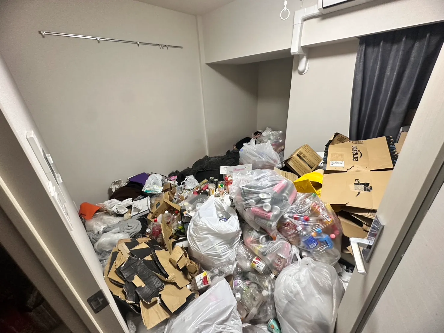 長年にわたりゴミが溜まり続けた状態のお部屋で、床が見えないほどのゴミと不用品で埋め尽くされており、悪臭も発生していました。