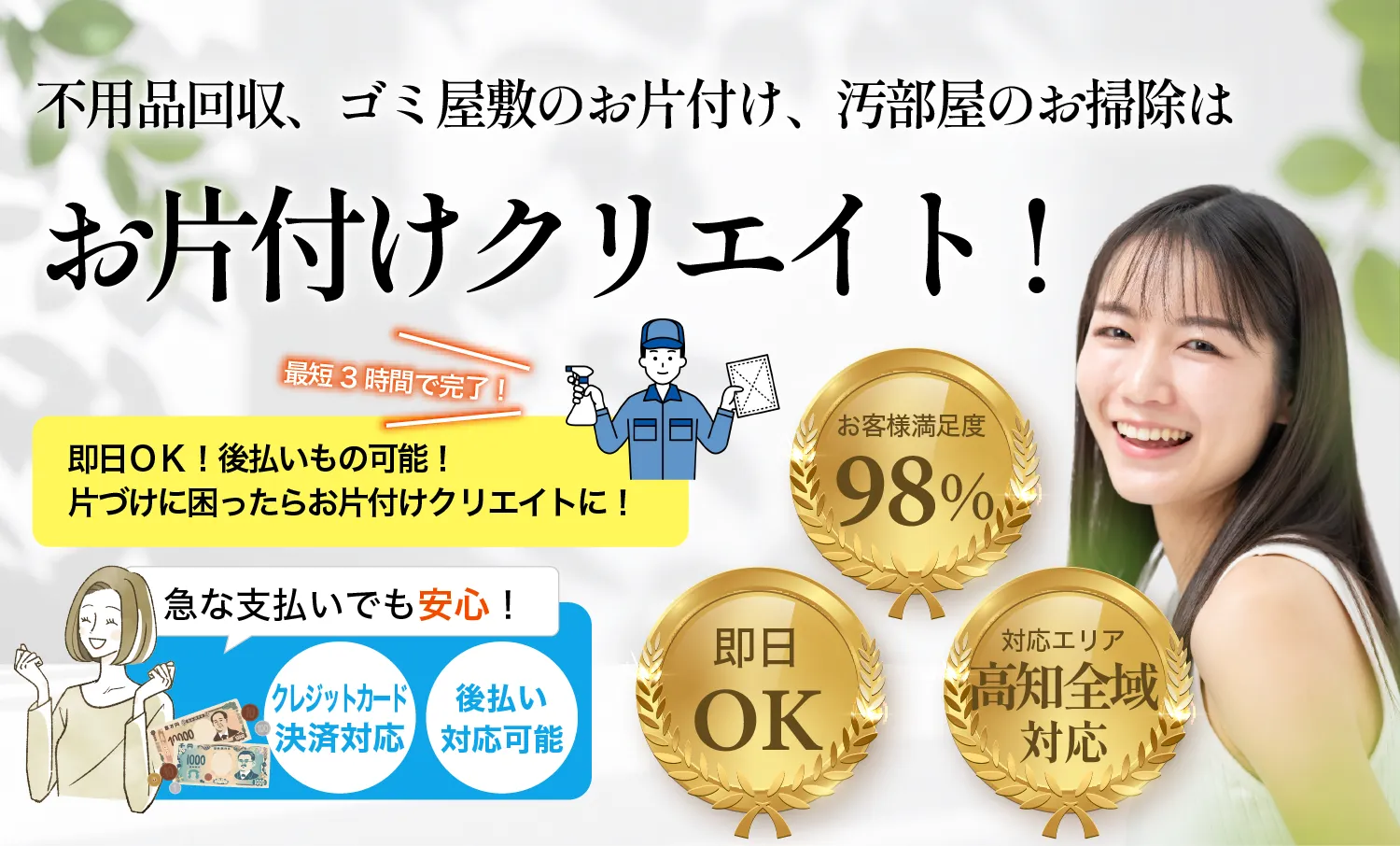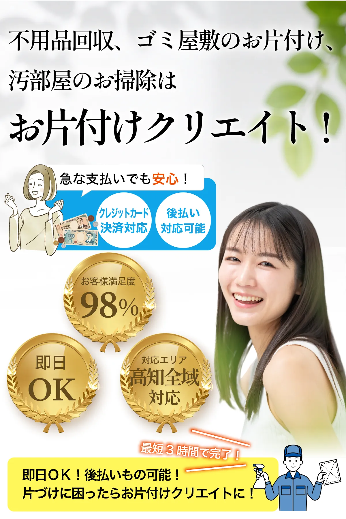 お部屋の片付けから不用品の回収など、お客様の片付けのお悩みをお片付けクリエイトが全て解決いたします!